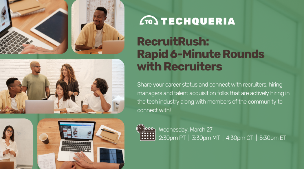 This virtual event is an opportunity to leverage our growing community to support your career growth. Attendees will be able to share their career status and connect with recruiters, hiring managers and talent acquisition folks that are actively hiring in the tech industry along with members of the community just seeking to connect.